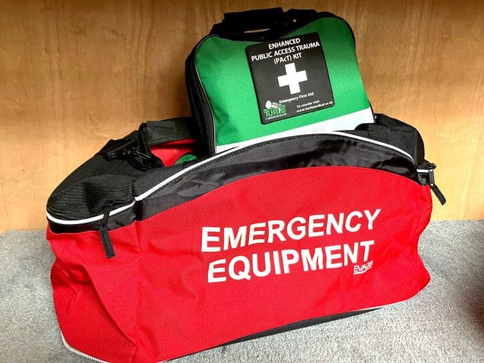 Large emergency holdall bag containing 5 of Turtle Medical’s Enhanced Public Access Trauma (PAcT) kits.